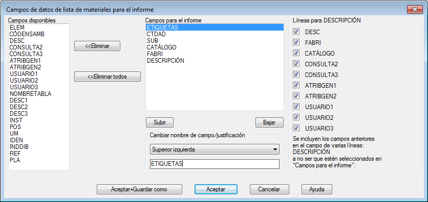 Nota: También puede seleccionar un campo en la lista Campos disponibles para añadirlo al informe. Puede reorganizar las columnas usando los botones Subir y Bajar. Al hacer clic en Aceptar - Guardar como, se guardarán estos parámetros en un archivo para un uso posterior.