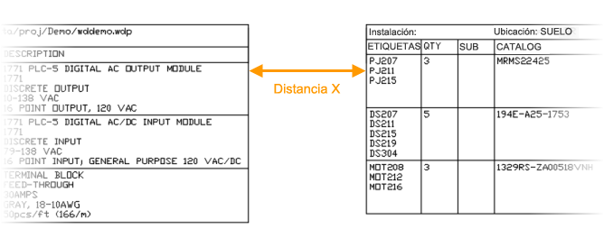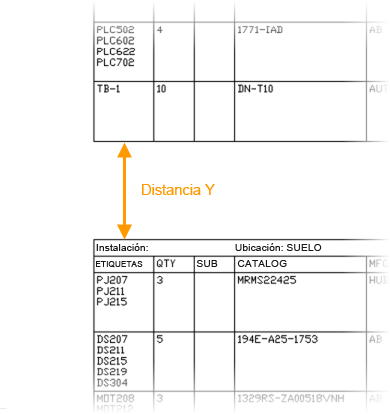 Los valores de la distancia X e Y definen la distancia desde el final de una sección de tabla hasta el principio de la siguiente. Se utiliza cuando varias secciones de la tabla de un informe se encuentran en el mismo dibujo. Un valor en blanco se interpreta como cero.