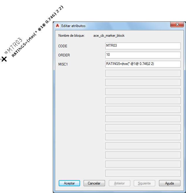 - Edite su valor de atributo MISC1 con el formato “{nombre de atributo}={expresión de AutoLISP}. Por ejemplo, convierta el valor de CV a kilovatios e incluya este valor en el atributo VALORES5 del símbolo de motor. Escriba la siguiente expresión en el atributo MISC1 del bloque de marcador: