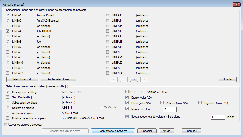- Seleccione los valores del proyecto y el dibujo que se deben actualizar en el cajetín.