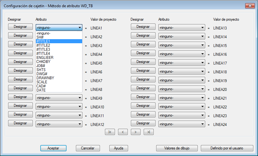 Configuración de cajetín lee las definiciones del atributo. Se abre el cuadro de diálogo Configuración de cajetín. Cada lista desplegable contiene todos los objetos de definición de atributo encontrados en el dibujo.