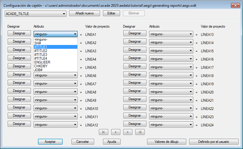 Cree el archivo WDT o defina el atributo WD_TB que asigna los valores del proyecto y del dibujo a los atributos del cajetín.