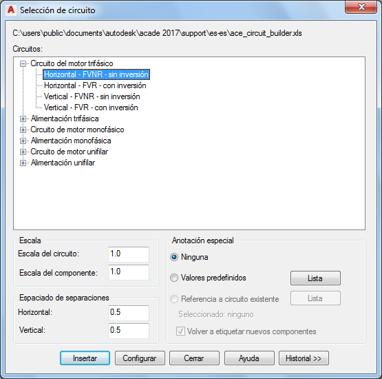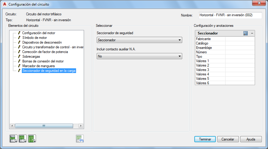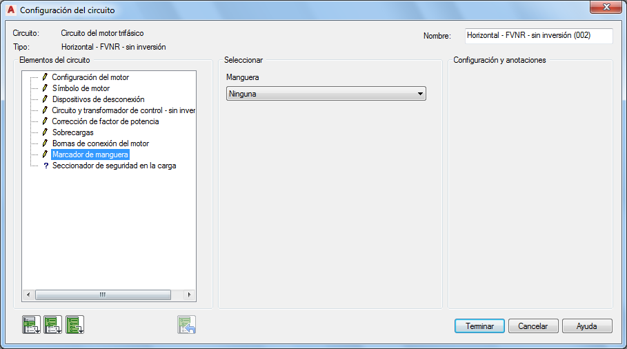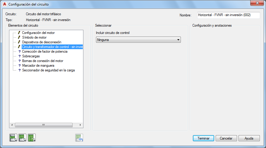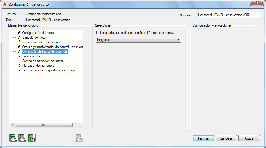 Sección Configuración y anotaciones: las opciones de esta sección cambiarán en función de las selecciones que haya realizado en las secciones Elementos del circuito y Seleccionar. Escriba valores o seleccione el botón Examinar para acceder a la tabla de consulta.