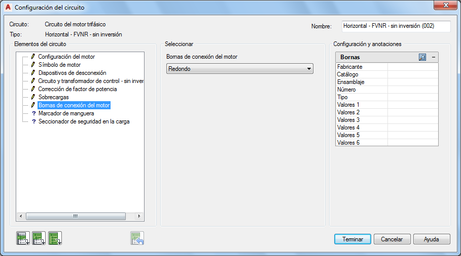 En la sección Seleccionar, elija Bornas de conexión del motor: Redondo.