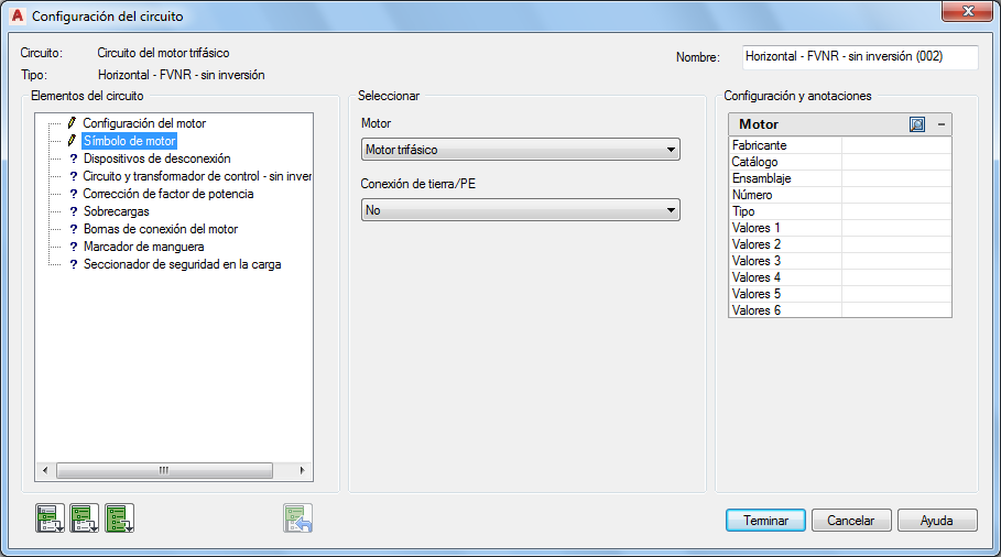Utilice el Generador de circuitos para insertar y configurar un circuito de motor trifásico.