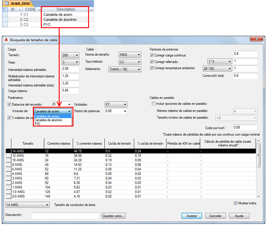 La tabla de descripción, XL&R_DESC, contiene las etiquetas utilizadas en el cuadro de diálogo Búsqueda de tamaños de cable para la lista de selección del tipo de canaleta o rodadura. Las etiquetas también se asignan a las columnas de las tablas de datos.