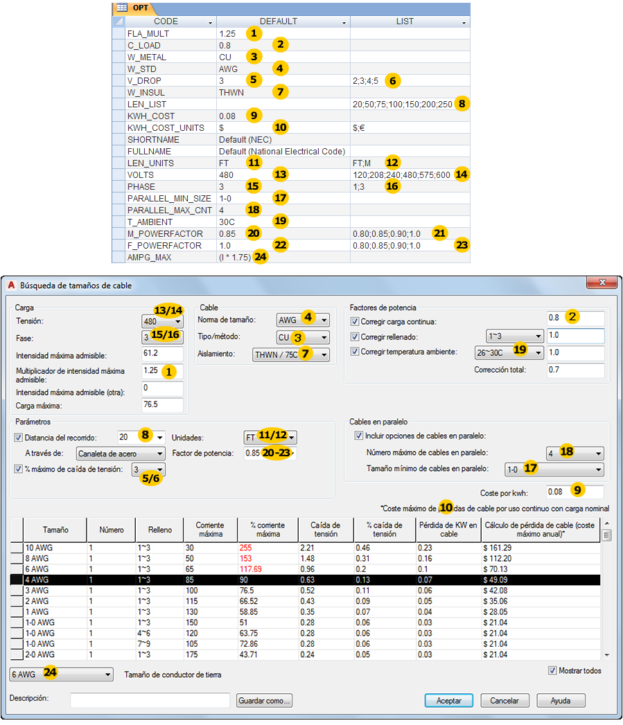 Las tablas de opciones contienen valores que definen valores por defecto y listas de opciones específicos de una norma eléctrica. Por ejemplo, el valor por defecto en cables de cobre, norma de tamaño AWG y los pies como unidades de longitud de los conductores. |