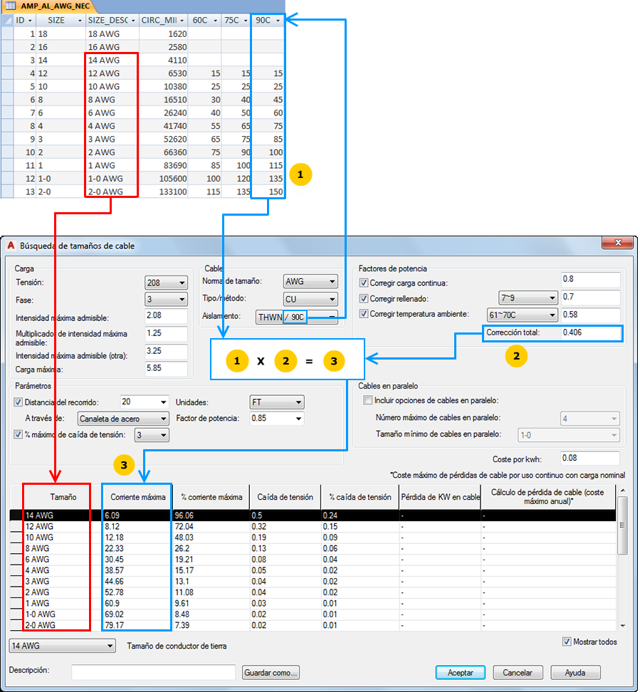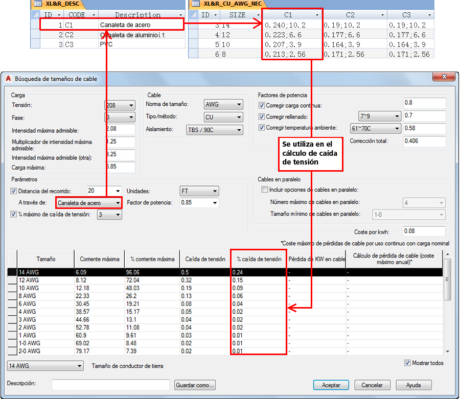 Por ejemplo, una tabla con el nombre AMP_CU_AWG_NEC contiene la información de corriente máxima de cable de los cables de cobre, tamaños AWG y paralelos que se encuentra en el NEC o National Electrical Code (Código eléctrico nacional).