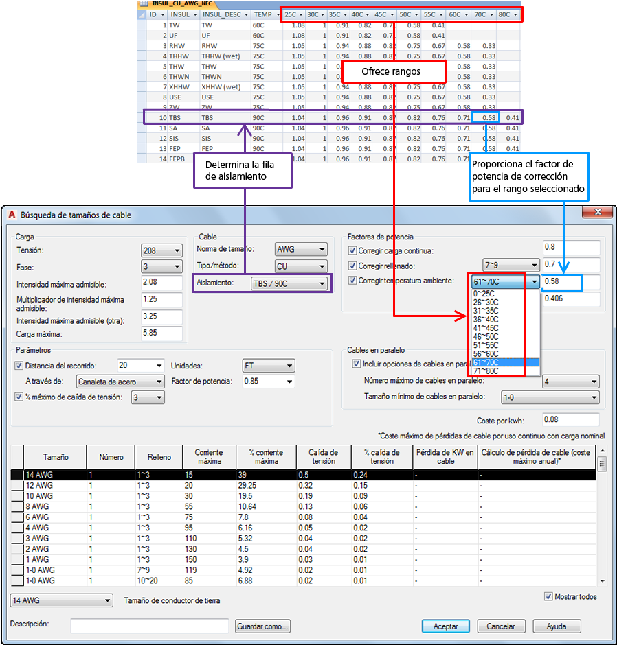 Por ejemplo, una tabla con el nombre INSUL_CU_AWG_NEC contiene la información de aislamiento de cables de los cables de cobre, tamaños AWG y paralelos que se encuentra en el NEC o National Electrical Code (Código eléctrico nacional).