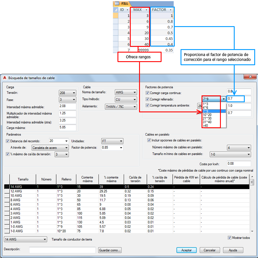 Cuando la misma canaleta, conducto o rodadura incluye varios conductores de cables que transportan corriente, es posible que se deba reducir la corriente máxima del cable. Los conductores de cables que transportan corriente se definen como cables de alimentación, no cables de tierra, neutros o de control. La tabla de relleno proporciona el factor de potencia basado en el número máximo de conductores de cables de alimentación.