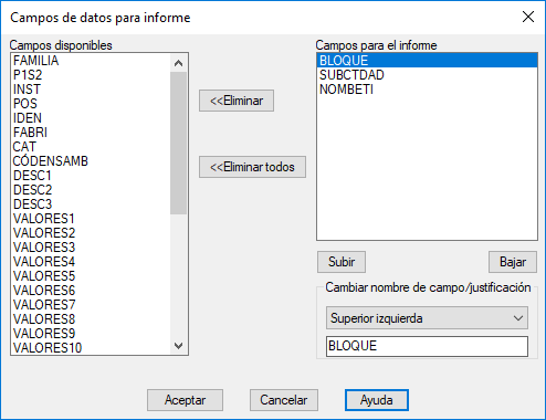 - Permite eliminar el campo seleccionado de la lista Campos para el informe.