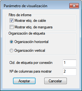 Este informe permite extraer los números de cable y puede utilizarse para crear etiquetas de cable o de manguera físicas. Se puede cambiar el formato de la etiqueta, especificar el número de etiquetas por número de cable y el número de columnas.