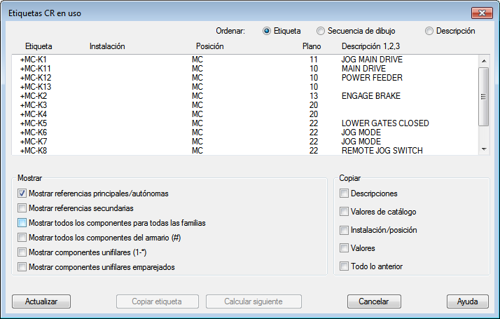 Permite ordenar la lista por etiqueta de componente, secuencia de dibujo o descripción.
