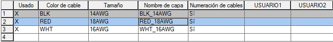 En el cuadro de diálogo Cambiar/convertir tipo de cable aparecen todas las capas de cable válidas definidas para el dibujo activo. En la lista de la rejilla aparecen el nombre de la capa de cable y las propiedades del cable como el color, el tamaño y las propiedades definidas por el usuario. Una "X" en la columna Usado indica que el nombre de capa está en uso actualmente.