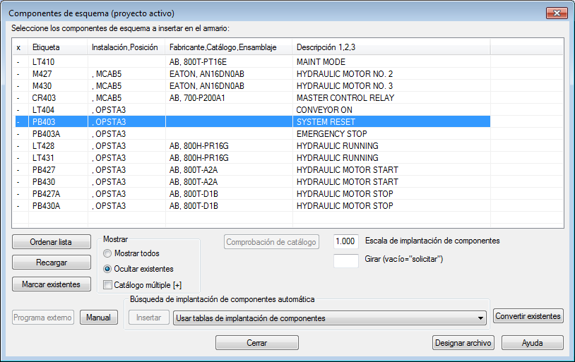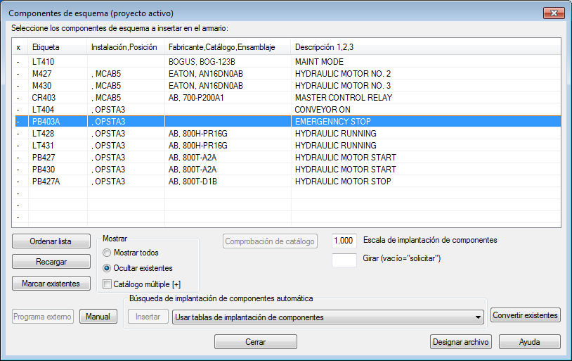 1. En el cuadro de diálogo Componentes de esquema (proyecto activo), seleccione: PB403A OPSTA3 EMERGENCY STOP.