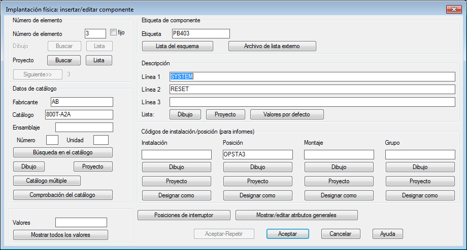 Nota: El cuadro de diálogo Implantación física: insertar/editar componente aparece cada vez que se inserta una implantación del armario. La información de la representación del esquema se traslada automáticamente a la representación de implantación del armario.
