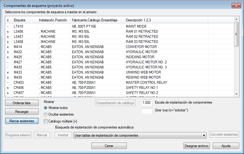 9. En el cuadro de diálogo Componentes de esquema (proyecto activo), haga clic en Marcar existentes. Una x marca las implantaciones de componentes que ya se encuentran en el proyecto.