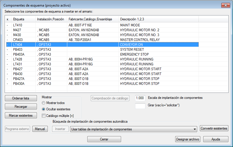 1. En el cuadro de diálogo Componentes de esquema (proyecto activo), seleccione LT404 OPTSTA3 TRANSPORTADOR ACTIVADO.