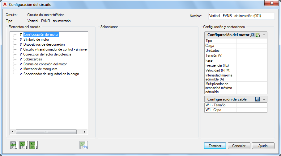 6. En la sección Elementos del circuito, seleccione Configuración del motor.