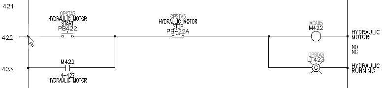 Los componentes estarán enlazados. Si vuelve al dibujoAEGS04.dwg y observa la bobina del motor de arranque, verá que muestra referencias a los tres contractos secundarios (además de un contacto de sello alrededor de PB427).