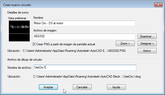 El circuito se guarda en la carpeta de usuario de AutoCAD Electrical toolset. Se puede acceder a él rápidamente desde el menú de símbolos Insertar componente o desde la herramienta Insertar circuito guardado.