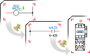 Permite desplazarse de referencia a referencia a través de todo el conjunto de dibujos del proyecto. Puede navegar a una etiqueta de componente, un número de catálogo, un número de cable, un número de elemento o a una celda de tabla de informe que contenga estos tipos de valores. Navegue en un equipotencial siguiendo las señales de origen y destino.