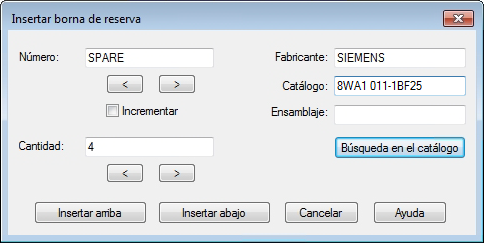 Ficha Asignación de código de catálogo: además de las operaciones que pueden realizarse en la ficha Regletero, es posible asignar, suprimir, copiar o pegar números de pieza de catálogo en las bornas.