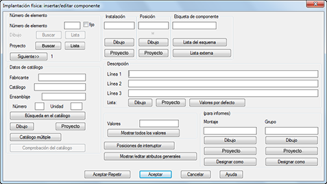 Actualice los valores según sea necesario. El cuadro de diálogo varía en función del tipo de componente de armario, es decir, implantación de componentes, etiqueta identificativa o borna.