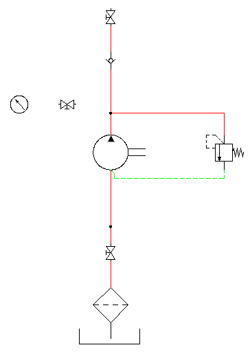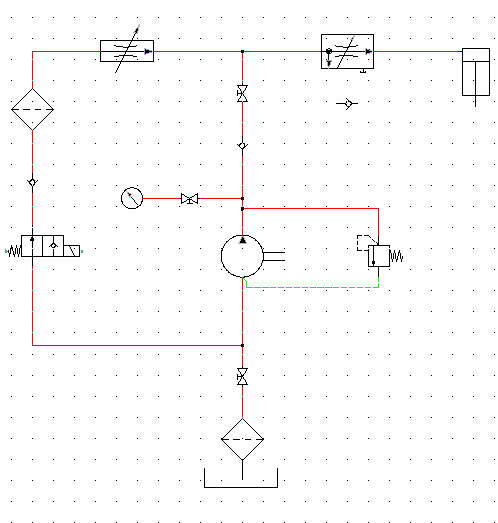 El resto del dibujo hidráulico consiste en insertar un calibre de presión y una válvula antirretorno en la parte izquierda de la bomba y, a continuación, insertar dispositivos (cilindro, válvulas reductoras, filtro, válvula de retorno y válvula de 2 vías) en la parte superior del dibujo.