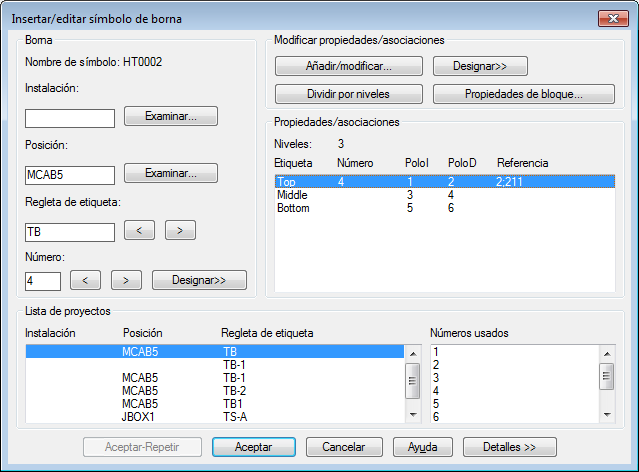 En el cuadro de diálogo Insertar/editar símbolo de borna, sección Propiedades/asociaciones, observe que ahora el bloque muestra tres niveles. La borna 4 se ha asignado al nivel superior del bloque.