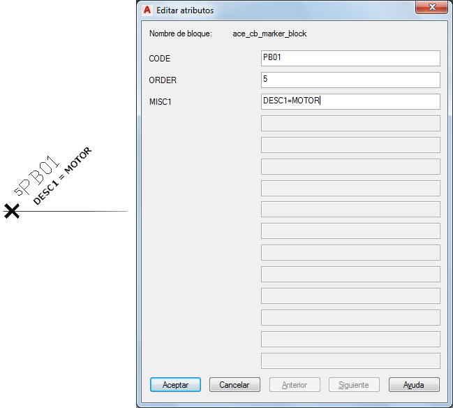 En AutoCAD Electrical toolset, localice el bloque de marcador que identifica el punto de inserción del símbolo de motor. Localice el valor del atributo CODE, por ejemplo MTR03.