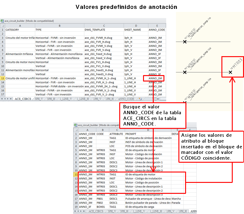 Este hoja proporciona un enlace entre el circuito seleccionado (identificado por el valor de ANNO_CODE), un bloque de marcador específico (identificado por su valor de CODE) y un atributo específico del bloque de marcador.