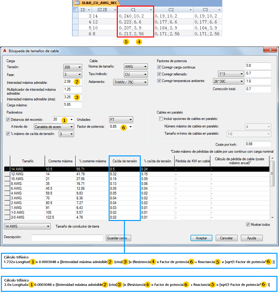 Muestra los conductores de cable disponibles, extraídos de la base de datos de normas eléctricas, para su selección. Los cables que no cumplen los requisitos de corriente máxima se muestran en rojo.