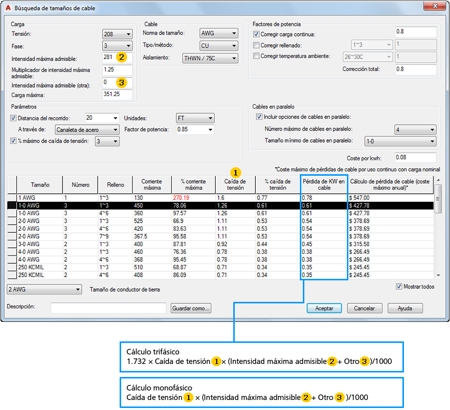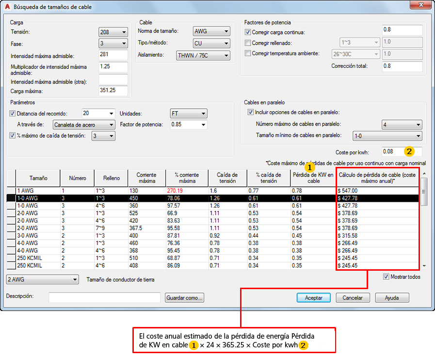 Especifique los parámetros de cable y seleccione un tamaño de cable en una lista de tamaños de cable que cumplen o superan los parámetros. En esta selección, las pérdidas calculadas de energía por tamaño de cable pueden proporcionar una valiosa información.