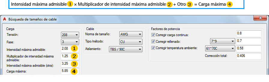 Muestra la carga máxima calculada para los conductores. Se basa en el valor de intensidad máxima admisible (otra) añadido al producto de la intensidad máxima admisible por el valor del multiplicador de intensidad máxima admisible. |