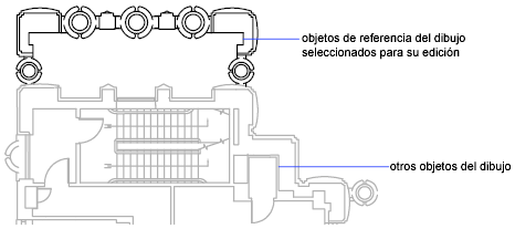 Los objetos designados de la referencia externa o del bloque seleccionados se extraen temporalmente y están disponibles para su edición en el dibujo abierto en ese momento. El conjunto de objetos extraídos se denomina conjunto de trabajo; este puede modificarse y guardarse para actualizar la referencia externa o la definición de bloque.