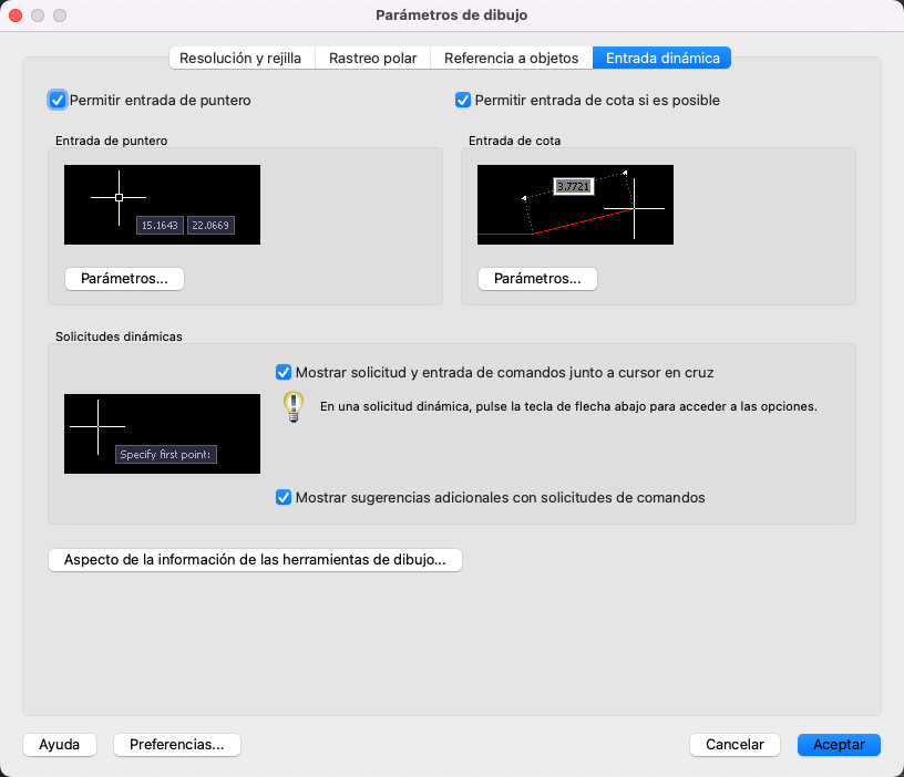 Controla la entrada de puntero, la entrada de cota, las solicitudes dinámicas y el aspecto de la información de herramientas de dibujo.