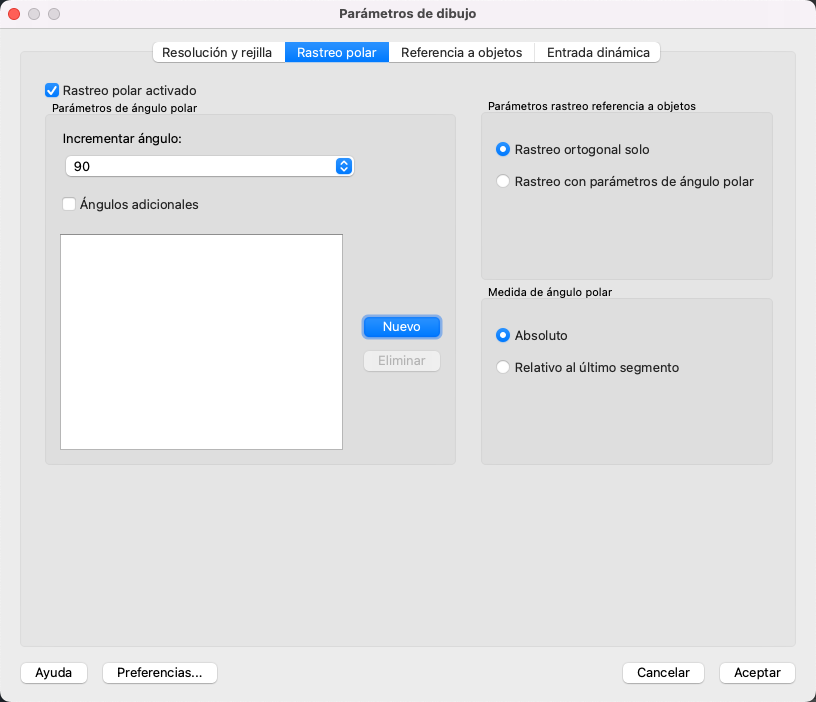 Sólo muestra rutas de rastreo de referencia a objetos ortogonal (horizontal/vertical) para puntos especificados de referencia a objetos cuando el rastreo de referencia a objetos se encuentra activado. (Variable de sistema POLARMODE).