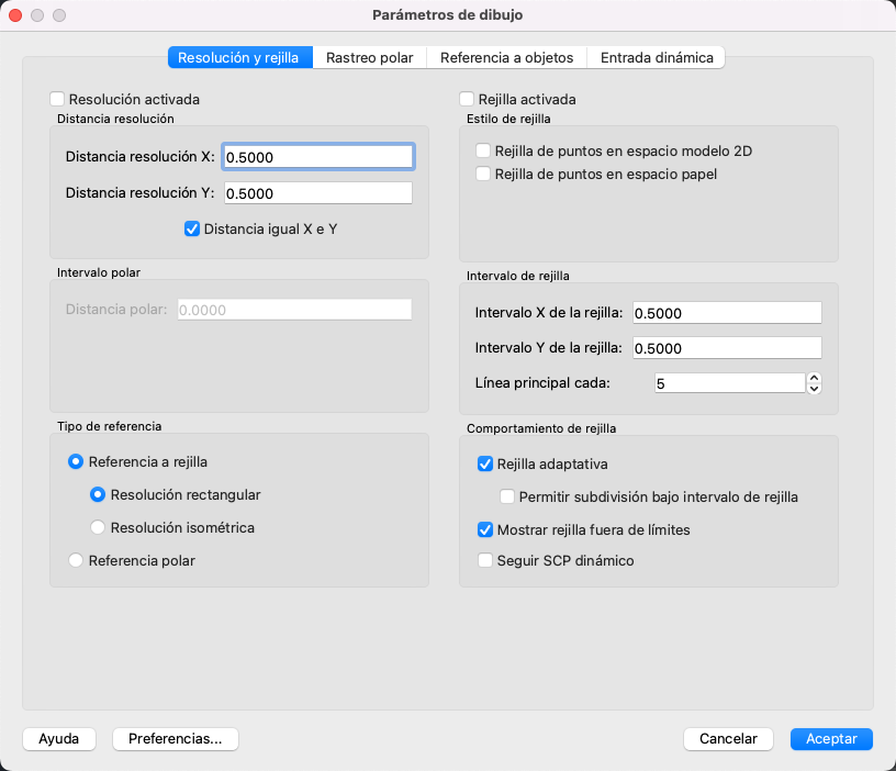 Controla una rejilla rectangular invisible de ubicaciones de referencia que limita el movimiento del cursor a intervalos X e Y especificados.