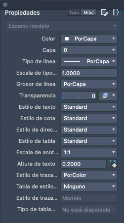 Muestra las propiedades del dibujo actual o de los objetos seleccionados.