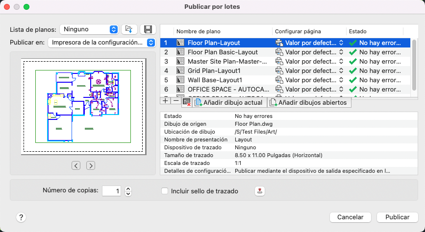 Puede publicar el conjunto de dibujos en un archivo PDF o enviarlo a la impresora que se haya guardado en la configuración de página para obtener una copia impresa.