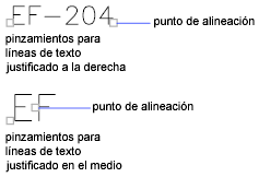 Los objetos de texto permiten el empleo de pinzamientos para realizar estiramientos, giros o ajustes de escala. Los pinzamientos de objetos de texto en una línea se encuentran en la esquina inferior izquierda de la línea de base y en el punto de alineación. Se puede cambiar el texto de una sola línea mediante DDEDIC y PROPIEDADES.
