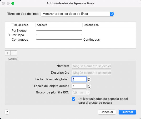 Muestra los nombres de los tipos de línea cargados. Para cambiar el nombre a un tipo de línea, elija el tipo de línea y, a continuación, vuelva a hacer clic sobre él y escriba un nuevo nombre. Los tipos de línea PORCAPA, PORBLOQUE, CONTINUOUS y los dependientes de las referencias externas no pueden renombrarse.