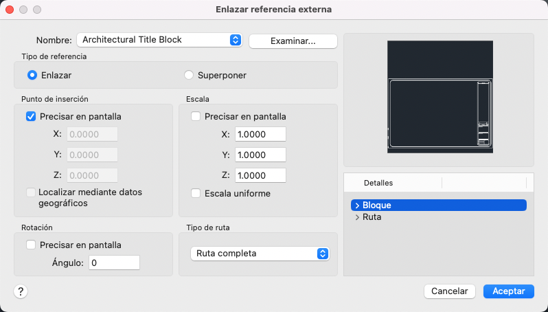 Muestra la información sobre el bloque y la ruta de la referencia externa que se va a enlazar.