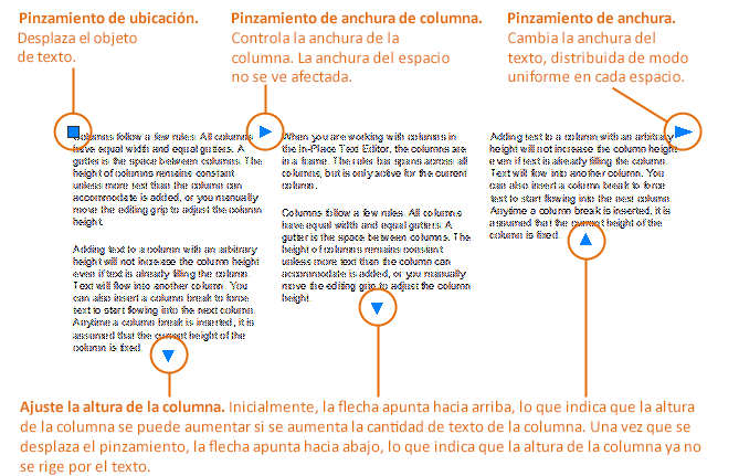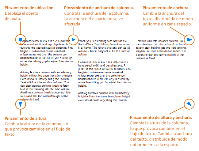Los pinzamientos controlan la ubicación del objeto TextoM, el espacio entre las columnas, y el movimiento vertical y horizontal de las columnas.