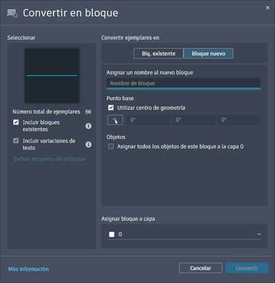 También puede convertir el objeto de origen o los ejemplares seleccionados en un nuevo bloque. En el cuadro de diálogo Convertir, defina un nuevo bloque. Para ello, especifique un nombre de bloque y un punto de inserción. Por defecto, el punto de inserción se establece en el centro de la geometría seleccionada.
