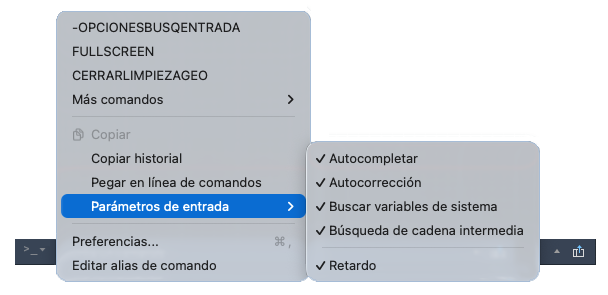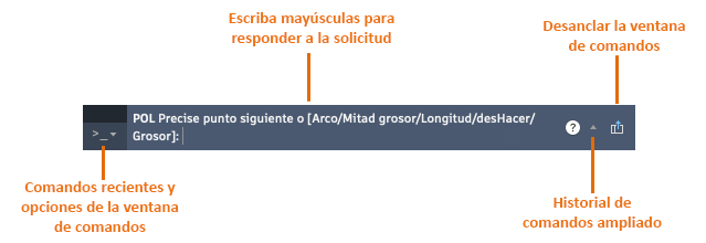 La ventana de comandos, cuyo tamaño se puede modificar, acepta comandos y variables de sistema, y muestra solicitudes que permiten completar una secuencia de comandos (incluidos los comandos que se hayan iniciado en otra ubicación como, por ejemplo, un conjunto de herramientas).