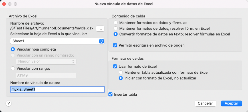 Para crear un vínculo de datos a partir de un archivo de Excel