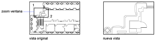 La esquina inferior izquierda del área especificada se convierte en la esquina inferior izquierda de la nueva visualización. La forma del área de zoom especificada no se corresponde exactamente con la nueva vista, que debe ajustarse a la forma de la ventana gráfica.