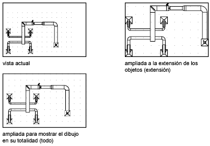 Extensión muestra una vista con la mayor ampliación posible que incluya todos los objetos del dibujo. Esta vista incluye los objetos que se encuentran en capas desactivadas, pero no los que se encuentran en capas inutilizadas.